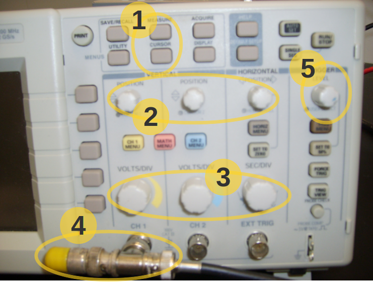 1 - Measure & Cursor buttonsMost oscilloscopes have some sort of button that allows you to display a cursor/dashed line and to allow to easily measure various parts of the display. Usually the cursor can be moved using the various knobs. In this model, the Measure tool can provide you with a frequency, max and min voltage values, and more. You may need to use the keys near the display to adjust options.