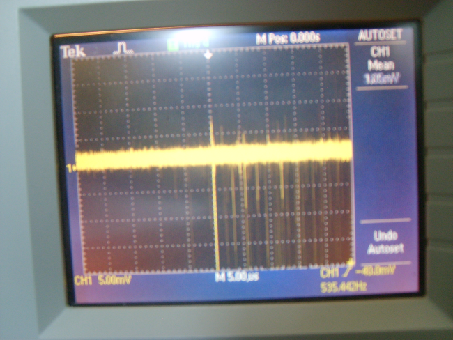 All PMTs will have noise associated with the electrical current powering it. A "good" PMT should have a small amount of noise, because strong noise could be accidentally detected as a cosmic ray strike. To see the noise band of a PMT, change the settings of the oscilloscope to (2mV/div, 5µs/div) and determine the thickness of the band using the Cursor tool. A PMT with a noise band around 1mV is usually pretty good.
