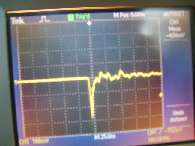 A "good" PMT will display a similar signal such as the one above. Note that the oscilloscope settings are at (100mV/div, 25ns/div) and the trigger level is set so the frequency of signals is around 100Hz. The sudden drop in voltage is caused by the capacitors inside the PMT becoming discharged. They discharge when an electrical pulse is created in the PMT as a result of a high energy particle striking the detector and briefly illuminating the internal scintillator.